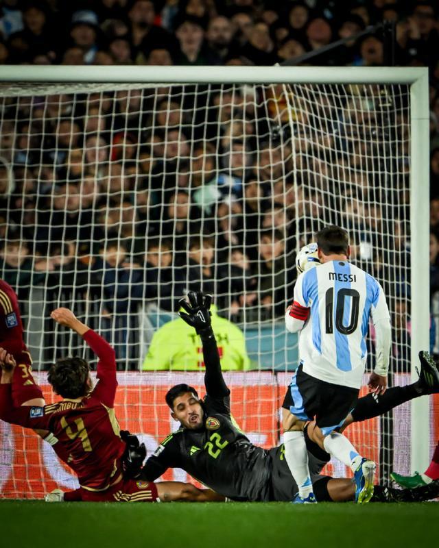 比赛的第39分钟,阿尔瓦雷斯突入禁区之后无私横传,面对四名委内瑞拉球员,梅西巧妙地选择了左脚挑射,球越过4人之后坠入球网。