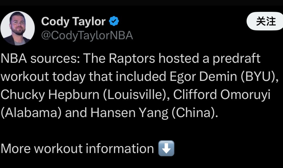 杨瀚森这波高质量的试训,根据猛龙的消息,他们也在试训杨瀚森,并且顺利完成。这是杨瀚森第11支球队了,整体的强度非常大。你要知道,这一两星期杨瀚森差不多试训了9支球队。昨天试训结束之后本来就精疲力尽了,他还是可以满状态备战猛龙。